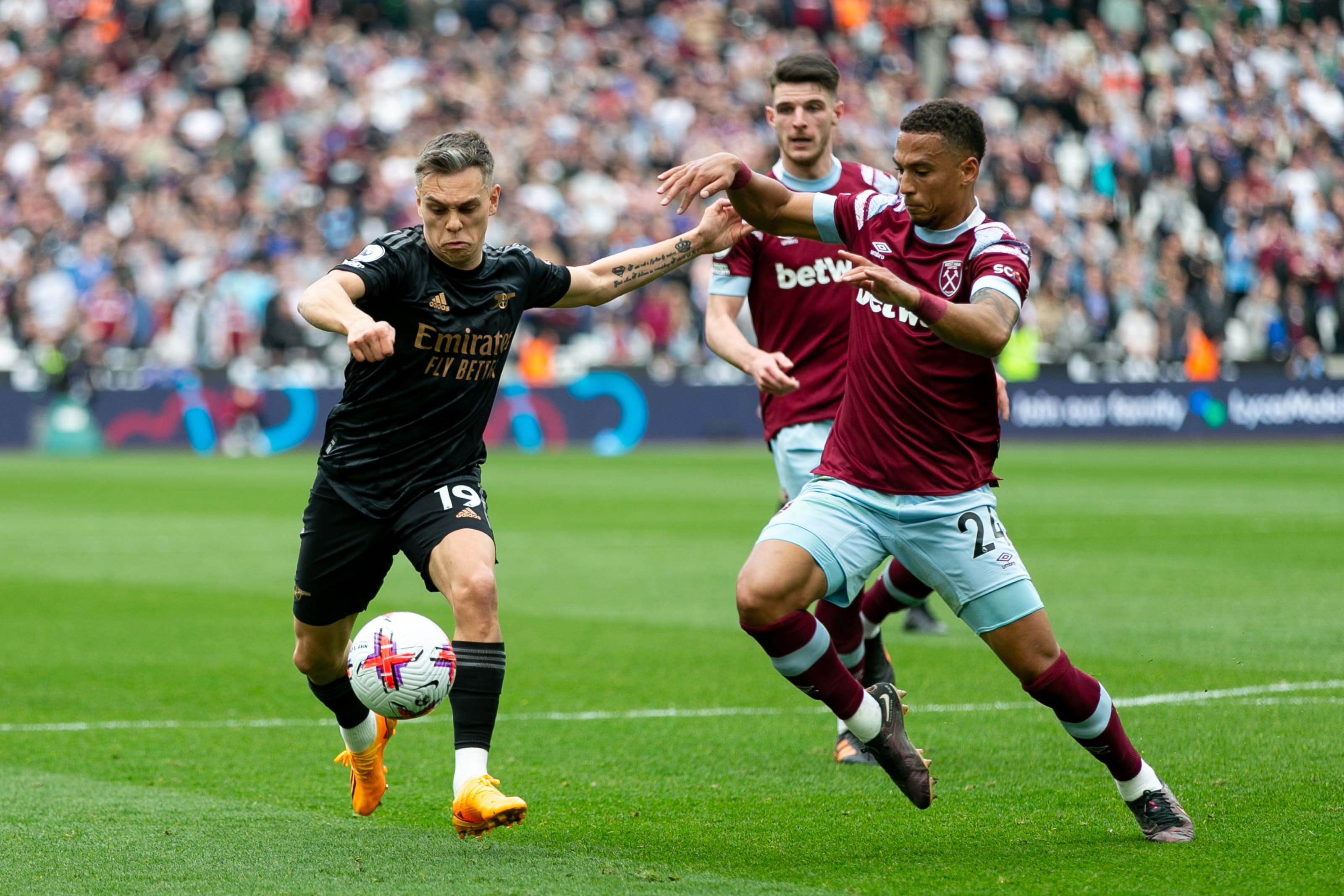 LONDON, ENGLAND - APRIL 01: Leandro Trossard of Arsenal runs with the ball whilst under pressure from Jack Harrison of Leeds United during the Premier League match between Arsenal FC and Leeds United at Emirates Stadium on April 01, 2023 in London, England. (Photo by Shaun Botterill/Getty Images)