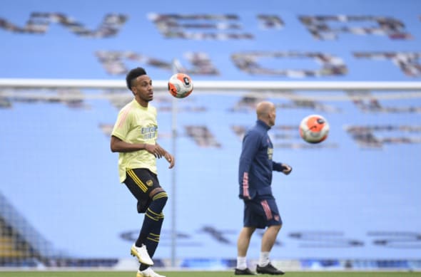 MANCHESTER, ENGLAND – JUNE 17: Pierre-Emerick Aubameyang of Arsenal warms up prior to the Premier League match between Manchester City and Arsenal FC at Etihad Stadium on June 17, 2020 in Manchester, United Kingdom. (Photo by Peter Powell/Pool via Getty Images)