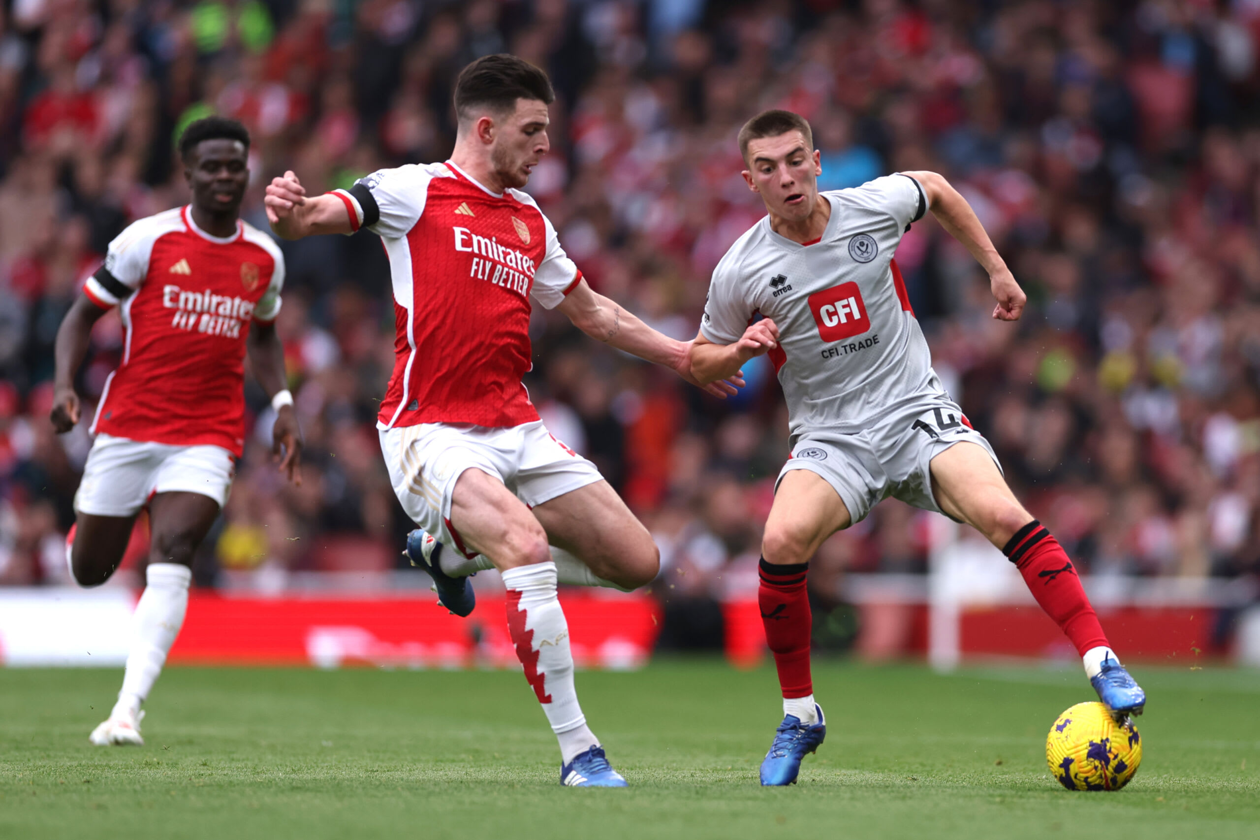 LONDON, ENGLAND – OCTOBER 28: Luke Thomas of Sheffield United is tackled by Declan Rice of Arsenal during the Premier League match between Arsenal FC and Sheffield United at Emirates Stadium on October 28, 2023 in London, England. (Photo by Alex Pantling/Getty Images)